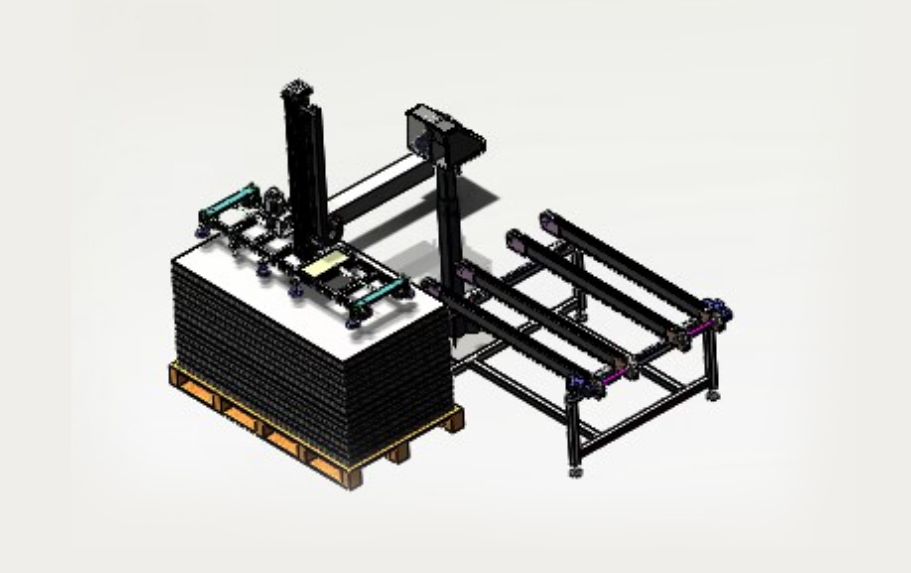 自動(dòng)排版機(jī)的主要功能單元有:玻璃輸送定位系統(tǒng)、抓取行走系統(tǒng)、視覺(jué)檢測(cè)系統(tǒng)、電控系統(tǒng)等;通過(guò)以上功能單元,實(shí)現(xiàn)了將自動(dòng)串焊機(jī)串焊好的電池串,按照工藝尺寸要求和排版方向順序自動(dòng)排版鋪設(shè)到玻璃(EVA已經(jīng)鋪設(shè))上,組成電池串陣列。玻璃/EVA通過(guò)傳輸線傳輸至指定位置,機(jī)械手抓取電池串實(shí)現(xiàn)CCD定位、自動(dòng)旋轉(zhuǎn)、自動(dòng)排版功能。設(shè)備通過(guò)同步帶傳輸與自動(dòng)生產(chǎn)線對(duì)接,實(shí)現(xiàn)了自動(dòng)流水作業(yè)。